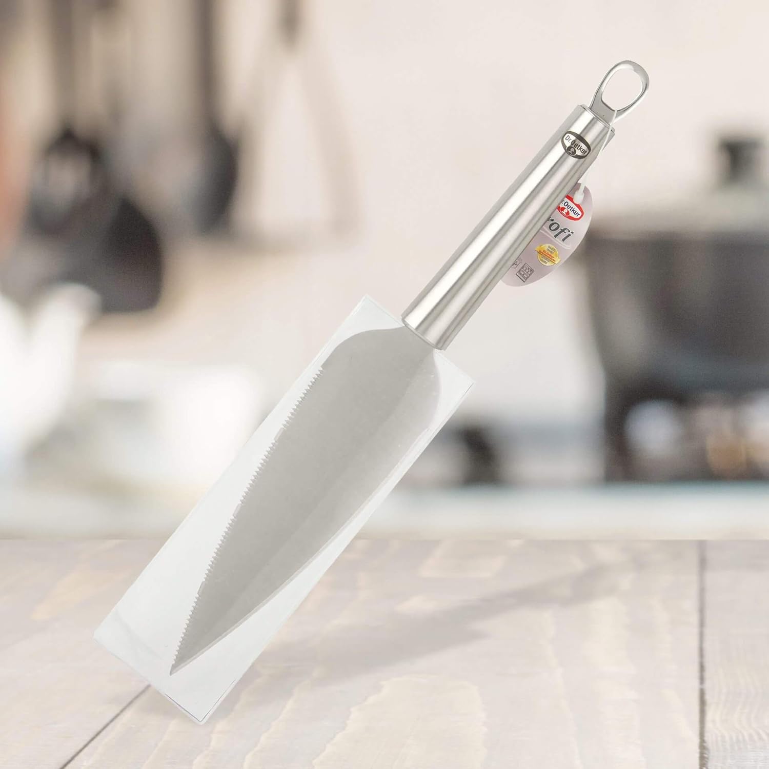 Ob Streuselkuchen, cremige Sahne- oder eindrucksvolle Hochzeitstorten: Selbst feinste Stücke lassen sich mit dem Kuchenschneider mühelos tranchieren. Nach dem Zerteilen der Torte kommt das Messer einfach als Tortenheber zum Einsatz.